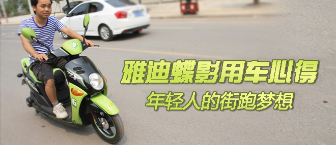 每个男人都有一个街跑的梦想,从小就希望有着一辆属于自己的“跑车”,这也能解释为什么说车是男人的小老婆。如今城市越来越拥堵,平时上班开车靠家里的代步小汽车怎能来得及,打从11年开始就已经考虑要购入一辆速度快的电摩,可一直没有找到钟爱的车款,直到12年5月,一次去探亲的时候在路边发现了它,一切都顺利的这么进行着,期间也考虑过很多牌子的车型,新日飞驰3代,爱玛极速,绿源时代骑士,可最终我还是选择性价比,舒适性较高的雅迪蝶影电动车。(更多:雅迪电动车价格)